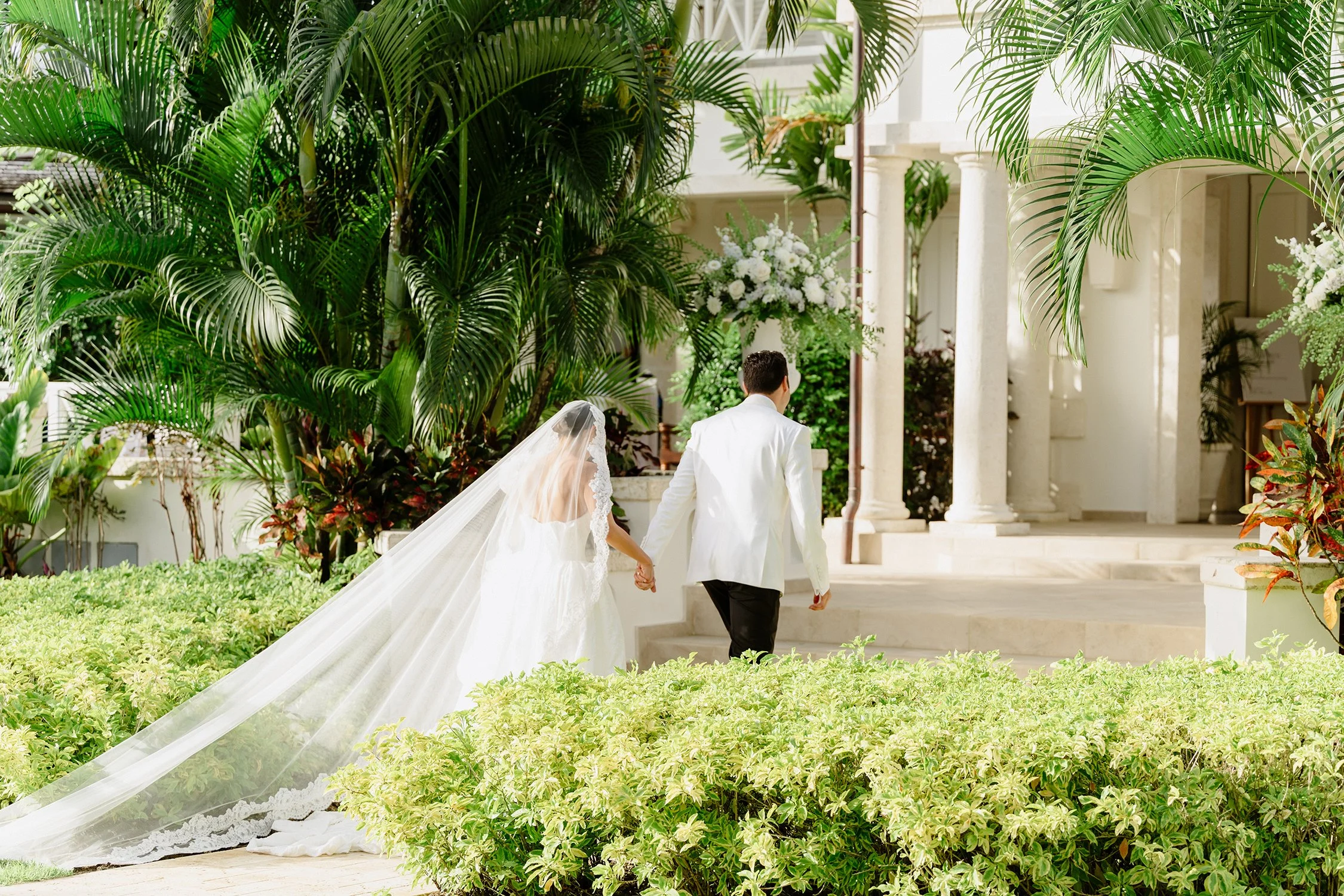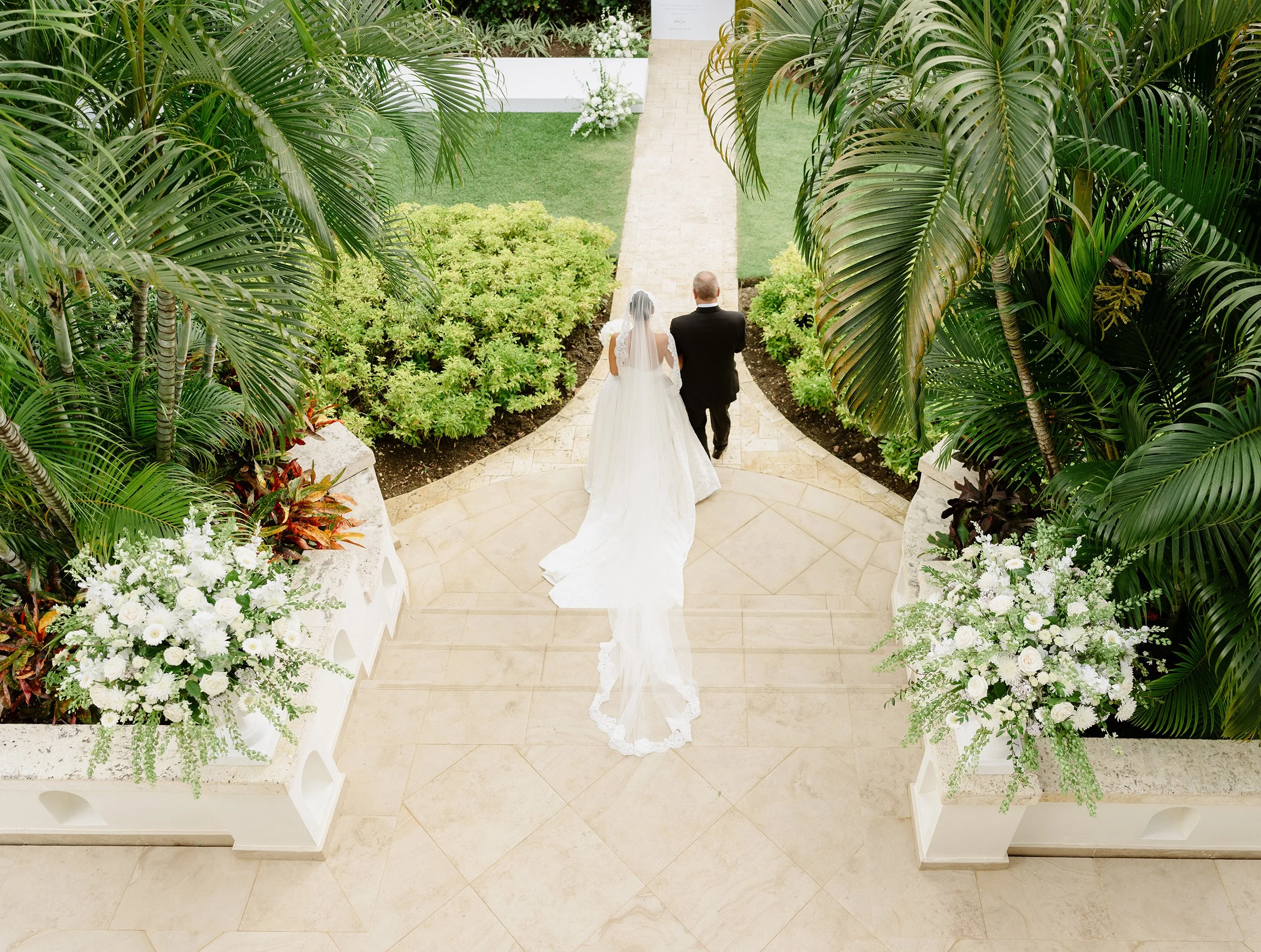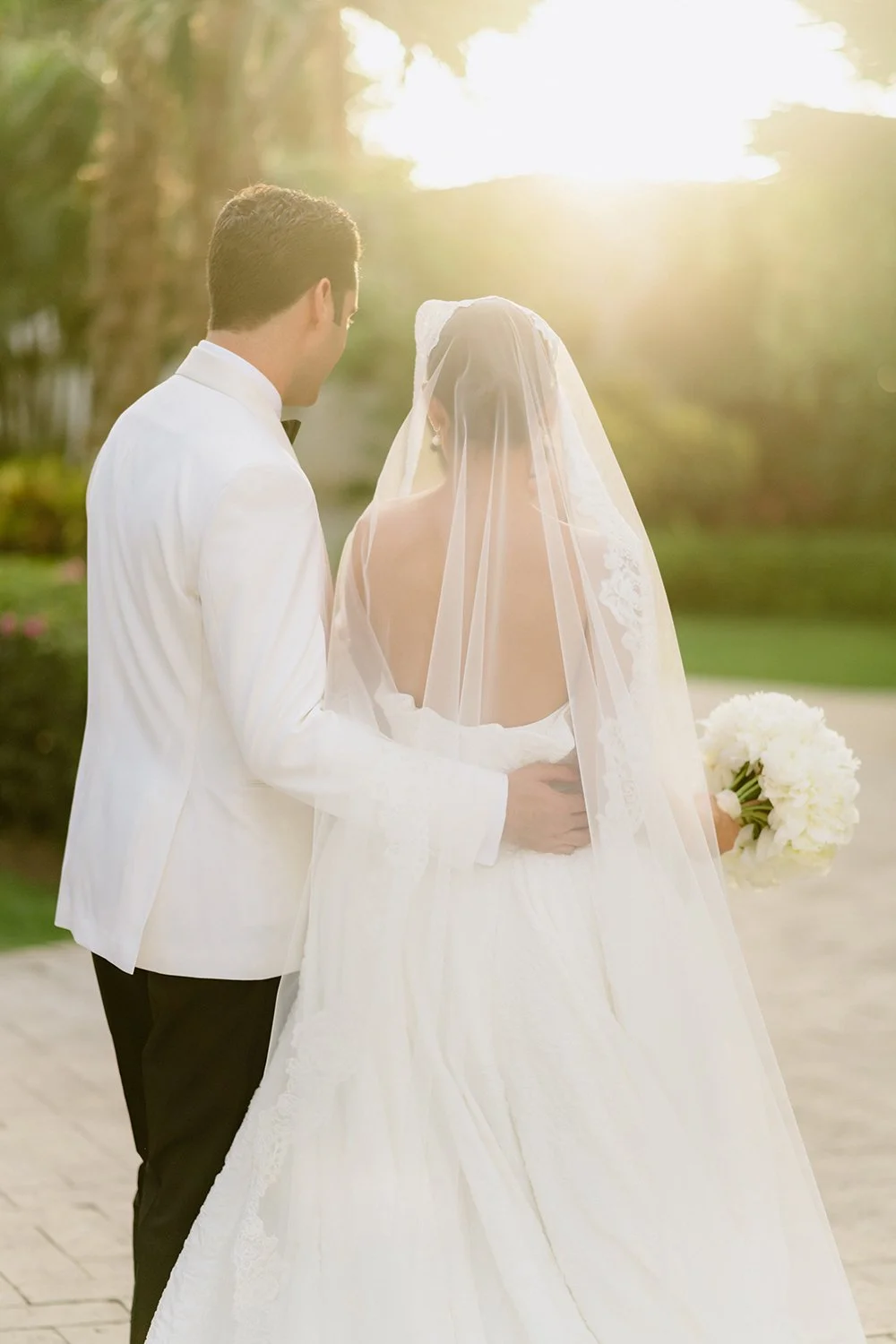 Mantillas were traditionally handmade in lace or silk and adorned with intricate floral motifs and delicate borders. Brides wear the veil over a decorative comb, known as a peineta, which lifts the lace slightly away from the head and lets it cascade softly down the back. This gentle drape distinguishes the mantilla, and unlike structured veils, it feels fluid, romantic, and graceful.
